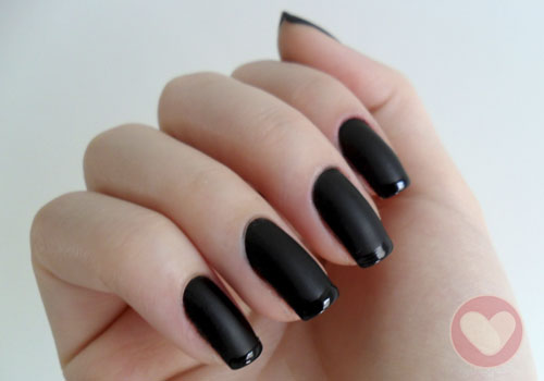 Usamos duas camadas do esmalte preto fosco Risqué Fast Fashion 01. Outra maneira de deixar as unhas com acabamento fosco é usar um esmalte preto comum e finalizar aplicando a base matte (base fosca).