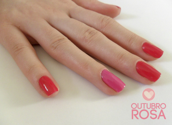 Para fazer a filha única Outubro Rosa, usamos Ocean Drive Pink - O Boticário (Miami Sunset) e no dedo anelar, Momento Penépole - Risqué (Penélope Charmosa).