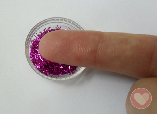 Depois de aplicar com o esmalte rosa, espere secar e aplique uma camada de base incolor. Com as unhas um pouco úmidas, separe os chuviscos em um potinho ou em uma superfície plana e com cuidado, pressione unha a unha, como na foto abaixo.
