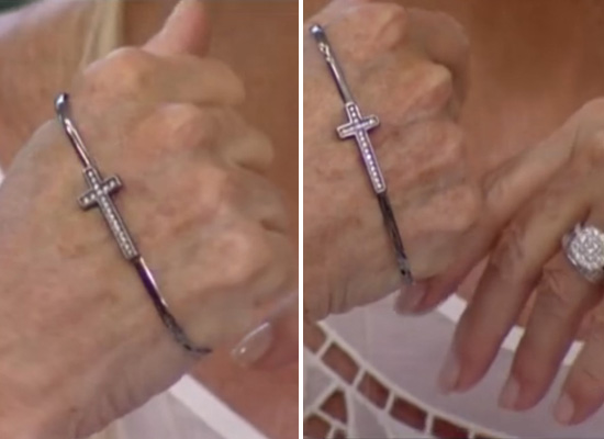 Falando sobre as tendências de moda para a próxima estação do SPFW 2013 e de Paris com o colunista Bruno Astuto, a apresentadora mostrou a pulseira de mão prateada de cruz com detalhes de brilhantes (foto abaixo). Além do acessório ser tendência, o colunista destaca que o prata também está de volta e promete aparecer mais nas peças.